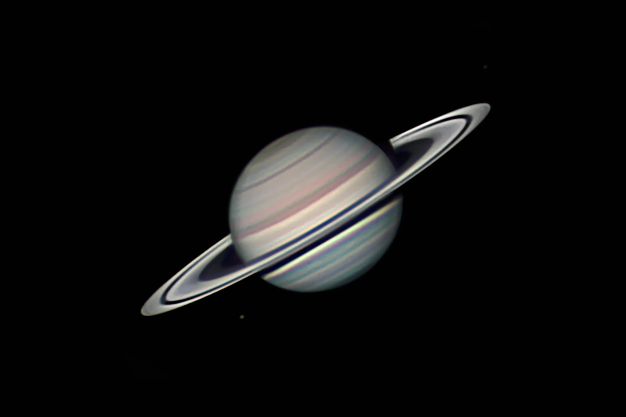 The moons Tehtys (left) and Enceladus (right) were close to the planet and some time later Tethys and its shadow transitted the southern Hemisphere of the planet.