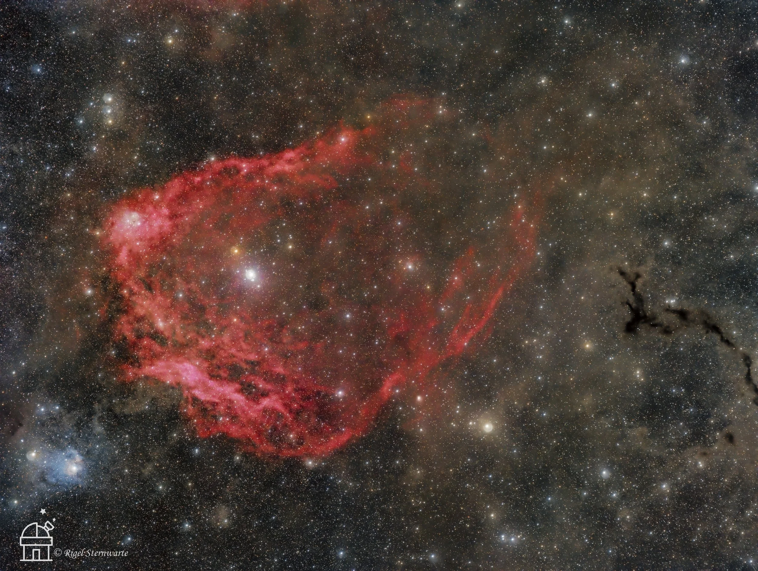 Image Description and Details: WR 134 est une étoile variable située à environ 6 000 années-lumière de la Terre dans la constellation du Cygne. WR 134 expulse une partie de ces couches externes qui sont ensuite soufflées par le rayonnement intense et les vents stellaires rapides de l’étoile. L’éjecta est ensuite entré en collision avec la nébuleuse ambiante entourant l’étoile pour former cette espèce de disque (en bleu dans l’image).