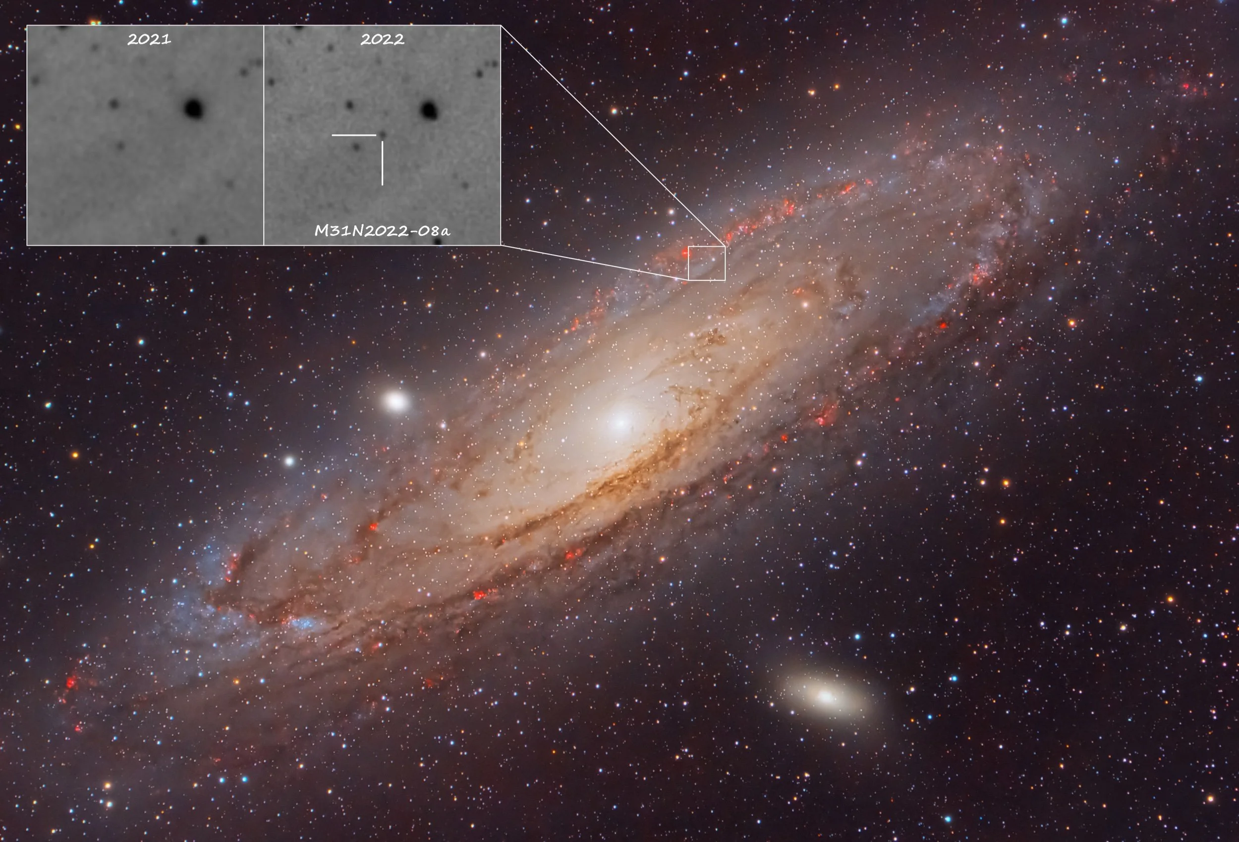 Image Description and Details : On August 4, the team members of the Monte Baldo Observatory (Italy) identified a Nova star of magnitude +16.6 in one of the arms of M31, which was catalogued as M31N2022-08a. Furthermore, the same team immediately noticed the coincidence of the position of the Nova they discovered with the Nova M31N2005-10a discovered on 11 October 2005 and, after meticulous checks, the coincidence of the position was confirmed. It is therefore a recurring Nova, which are the most followed and studied because they are considered potential candidates to become very bright Supernovae.